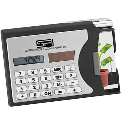 Keep your figures straight and your business cards handy with this Calc & Carry Solar Calculator w/Pen & Business Card Compartment. The slim calculator fits nicely in a pocket or purse, features the SFI logo on front, and powers up indoors or out.
